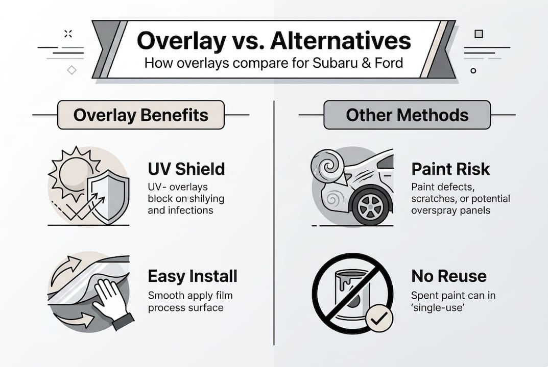 Emblem customization encompasses several methods, each with distinct advantages and limitations. Understanding how overlays stack up against alternatives helps you make informed decisions about personalizing your Subaru or Ford. The three primary methods are vinyl overlays, Plasti Dip coating, and OEM blackout emblems, each serving different aesthetic goals and protection levels.