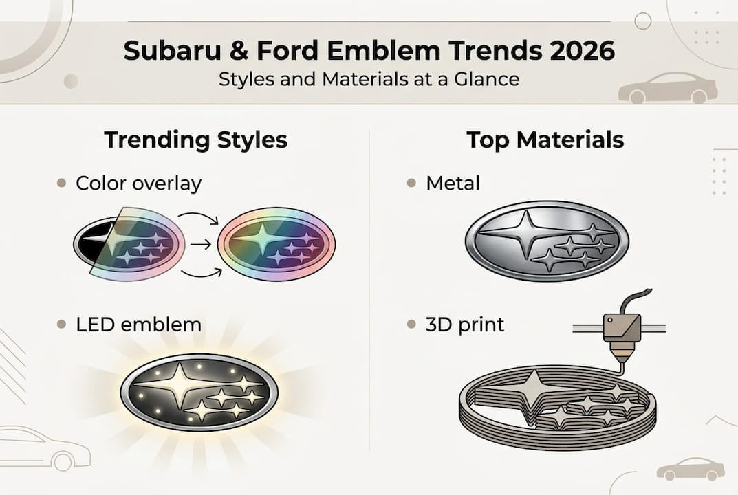 | Personalization leads trends | Subaru and Ford communities are driving the 2026 custom emblem boom for creative self-expression. |