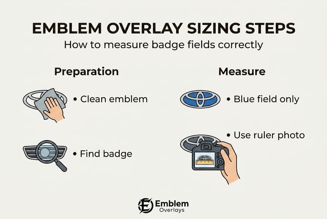 Before you order, it is worth reviewing the stepwise measurement process in detail, and making sure you know how to prep your emblem for overlay application so adhesion holds long-term.